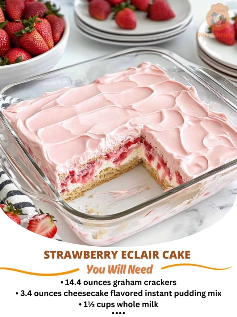 This Strawberry Éclair Cake is the perfect combination of fluffy, creamy, fruity, and chocolatey goodness. With its elegant presentation and irresistible flavors, it’s ideal for special occasions or simply treating yourself. Easy to assemble yet impressive, this cake delivers that gourmet feel without the fuss, making it a staple dessert for your recipe collection.