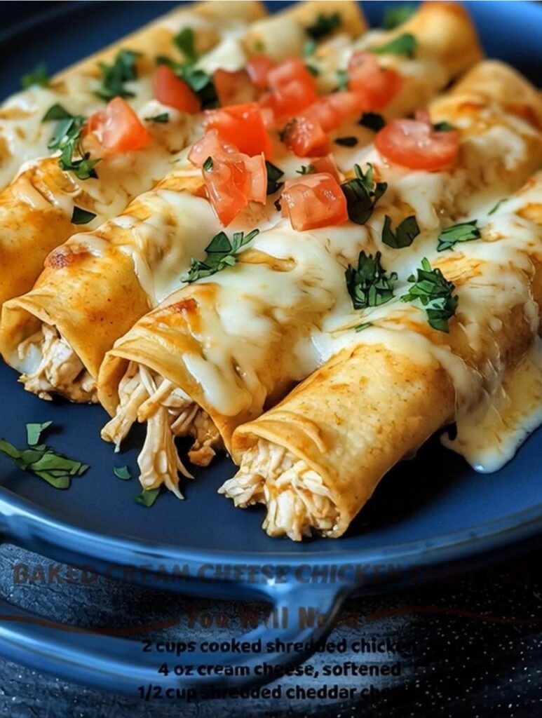 Crispy baked taquitos filled with tender chicken, creamy cream cheese, and savory seasonings.