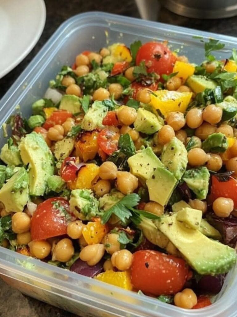 A fresh, creamy salad made with chickpeas, avocado, crisp vegetables, and a bright lemon dressing.