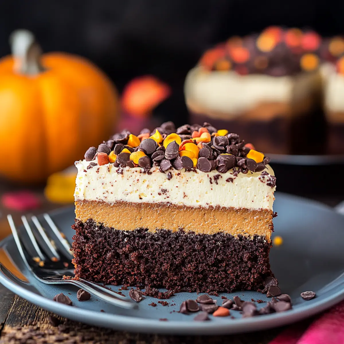 Layers of Delight: This magical cake combines three scrumptious layers—rich chocolate cake, spiced pumpkin pie, and fluffy vanilla mousse—creating a flavor experience like no other.