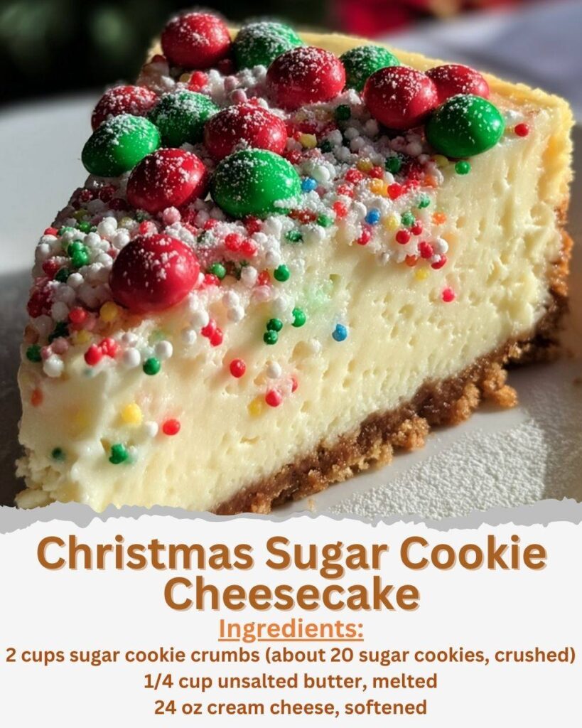 If you’re looking for a show-stopping dessert to brighten your holiday table, this Christmas Sugar Cookie Cheesecake is IT. 🎄✨ Creamy, rich, and layered over a buttery sugar cookie crust, it’s like all your favorite desserts bundled up in one beautiful slice. And with red and green candy-coated chocolates scattered on top like cheerful ornaments? You’ve got the holiday spirit baked right in.