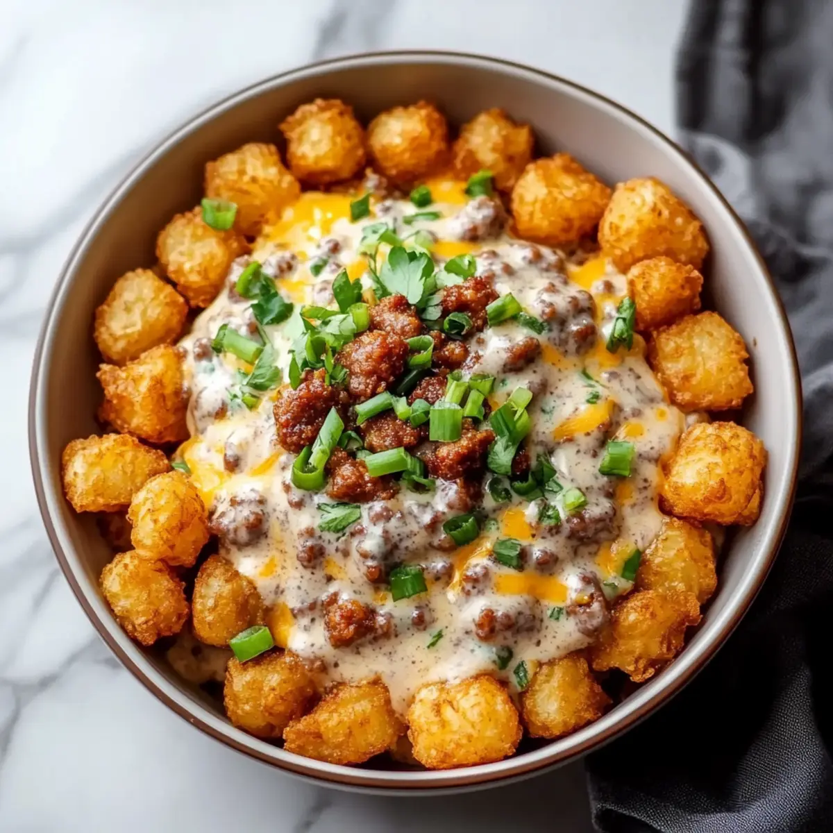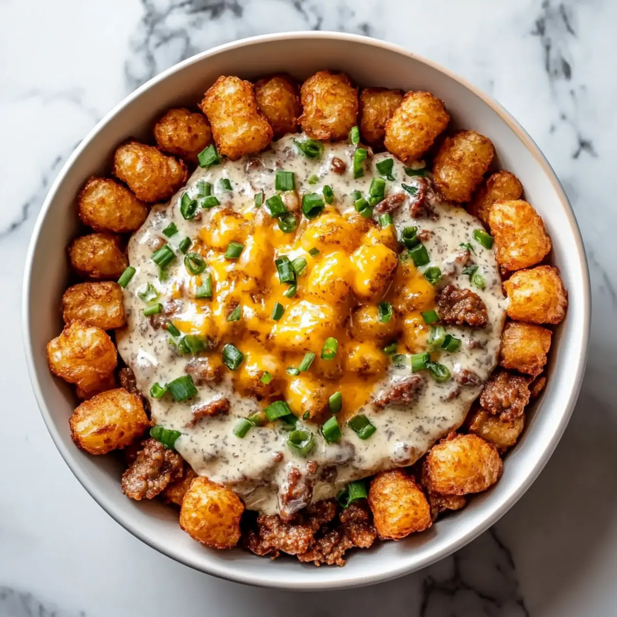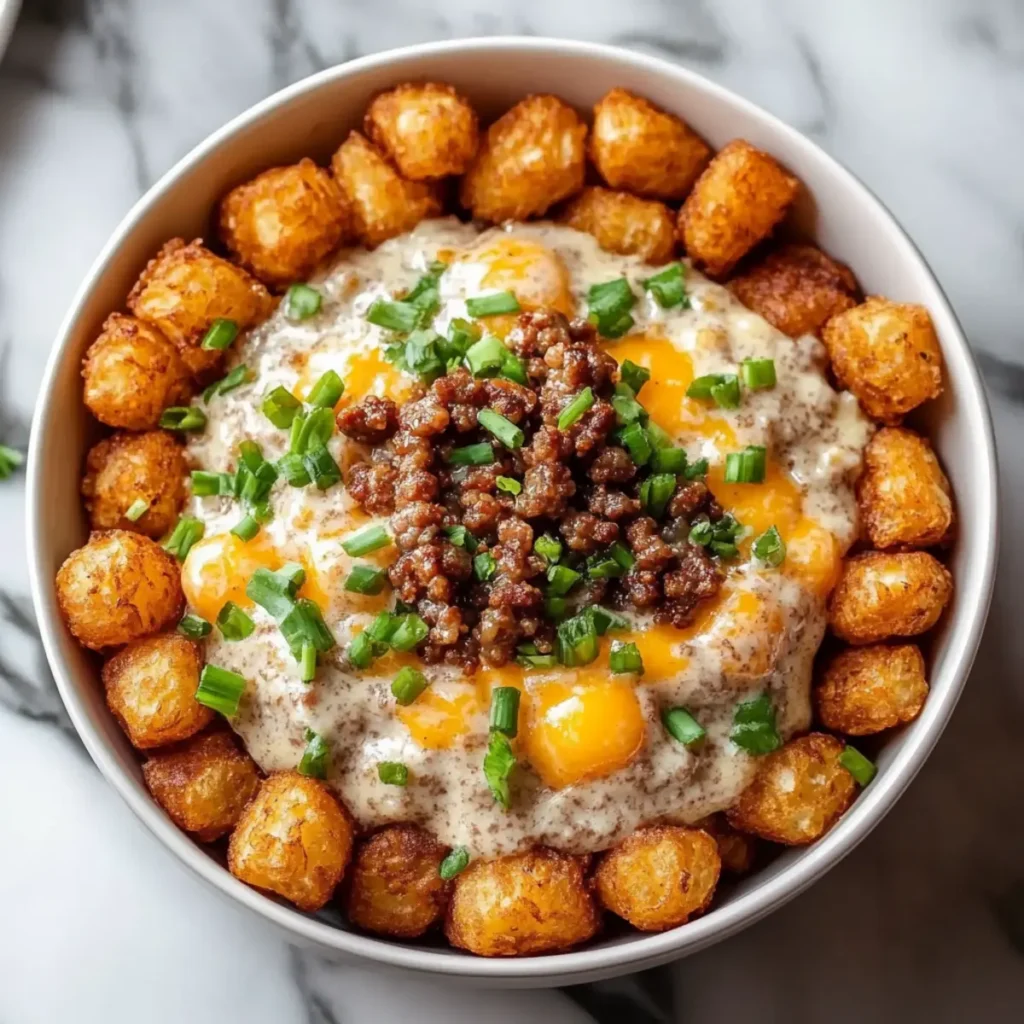Assemble the Bowl: Layer your crispy tater tots in a bowl, followed by scrambled eggs. Pour over the savory sausage gravy, then generously sprinkle shredded cheddar cheese on top.