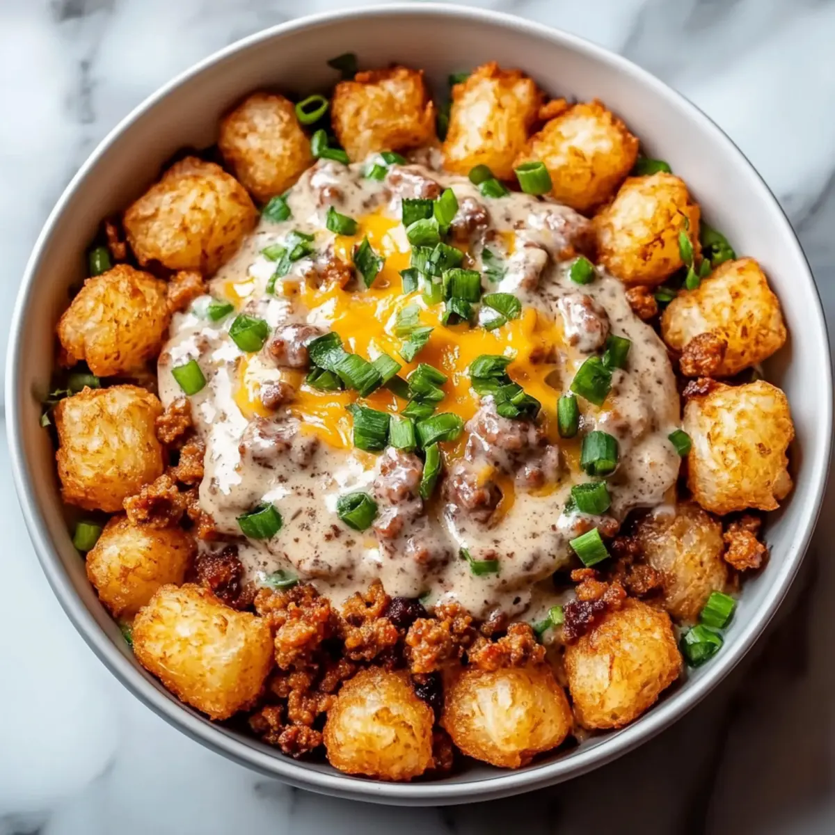 The Best Crispy Tater Tot Breakfast Bowl with Sausage Gravy