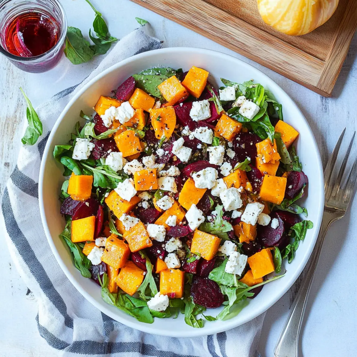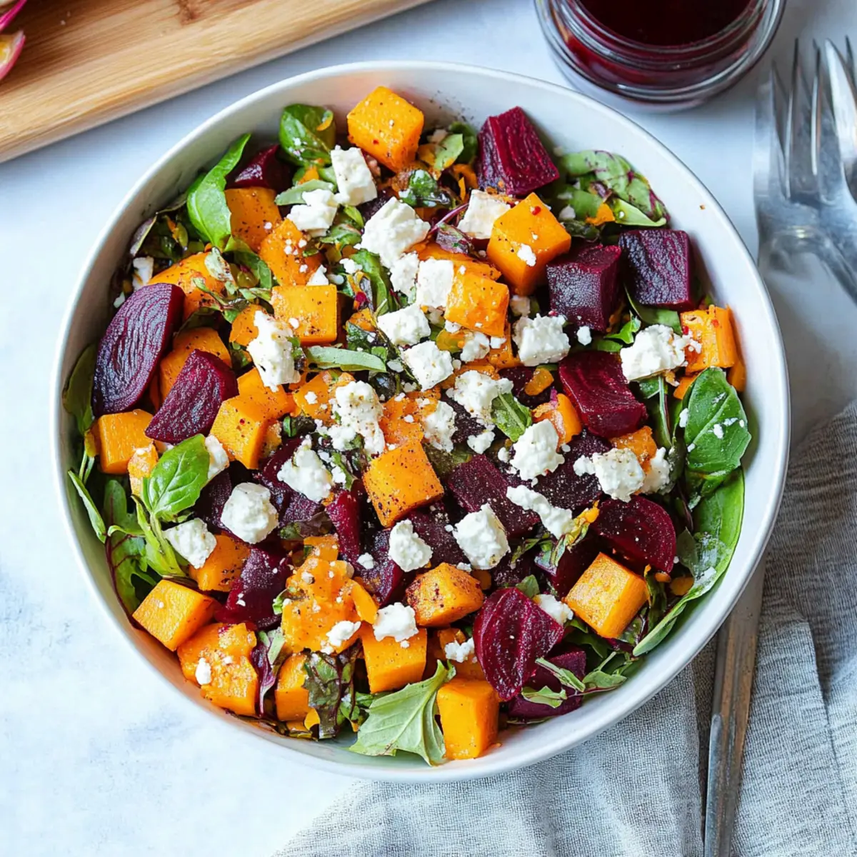 A vibrant and easy Butternut Beetroot and Feta Salad perfect for fall, combining roasted squash, earthy beets, and creamy feta.