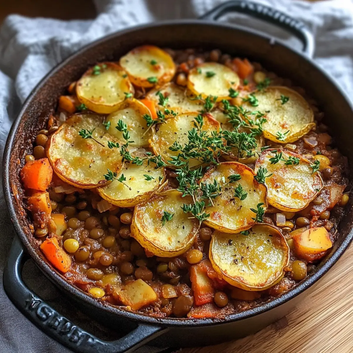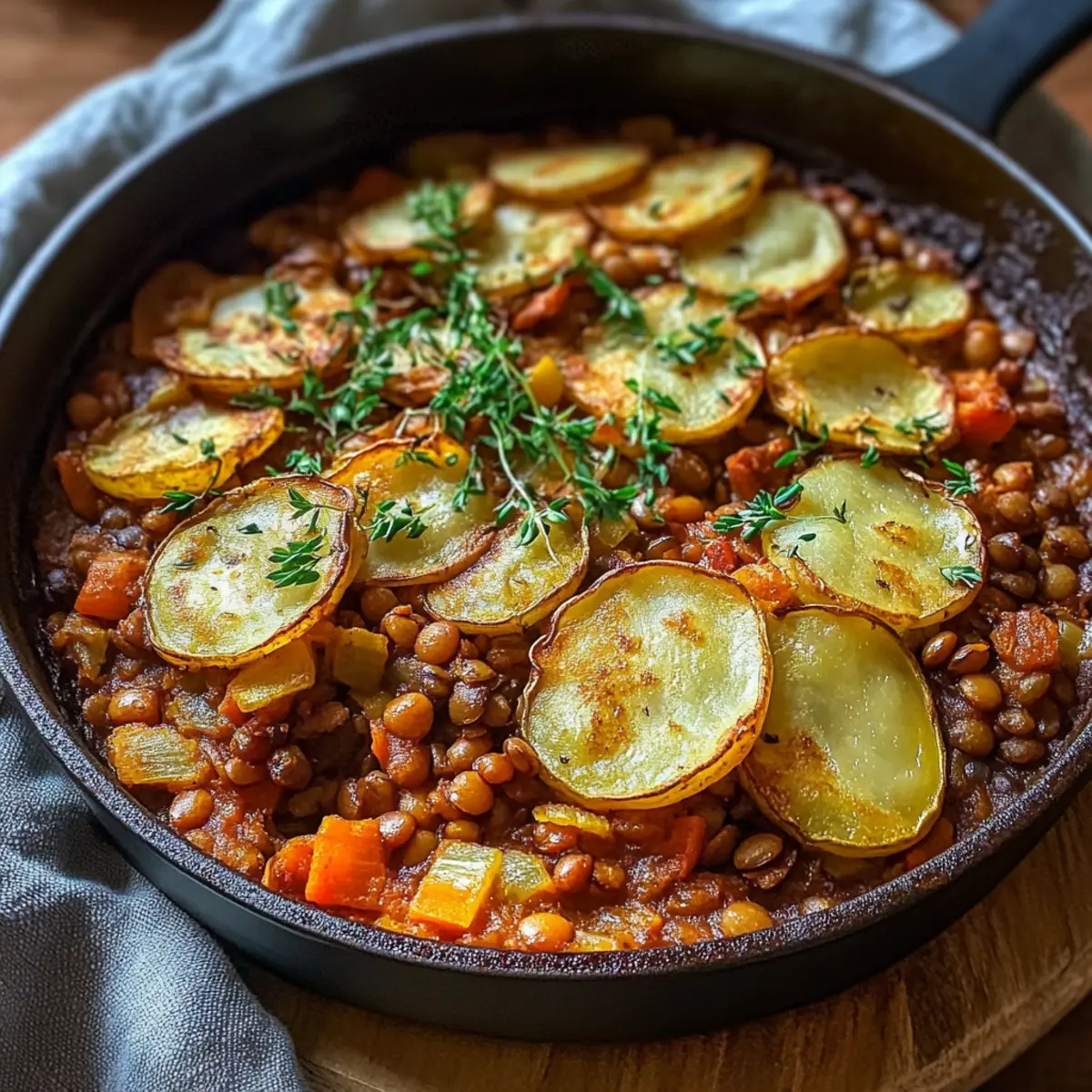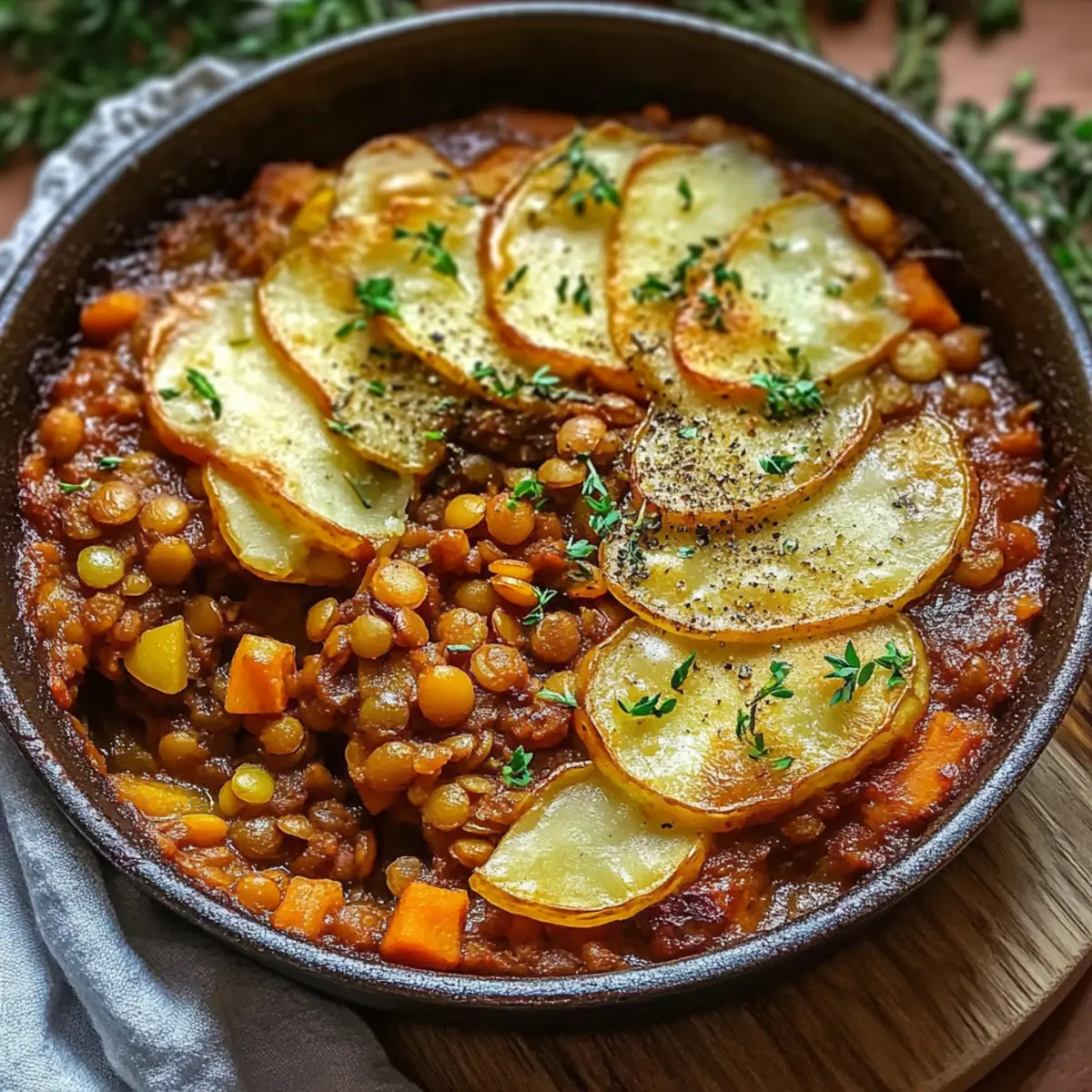 Slice the potatoes thinly, making sure they are less than 0.5 cm thick. Layer these potato slices generously over the lentil mixture in a baking dish; this will create that lovely, crispy topping.
