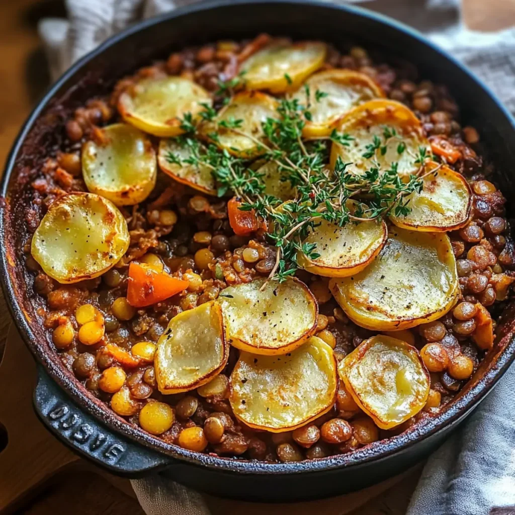- Slice the potatoes thinly and layer them over the lentil mixture in a baking dish.