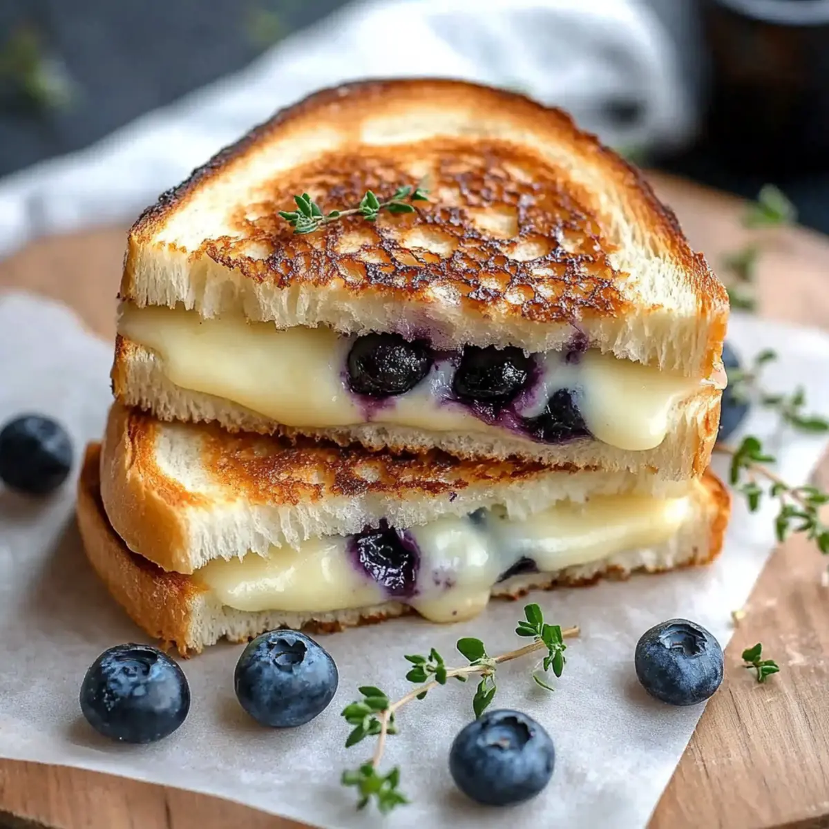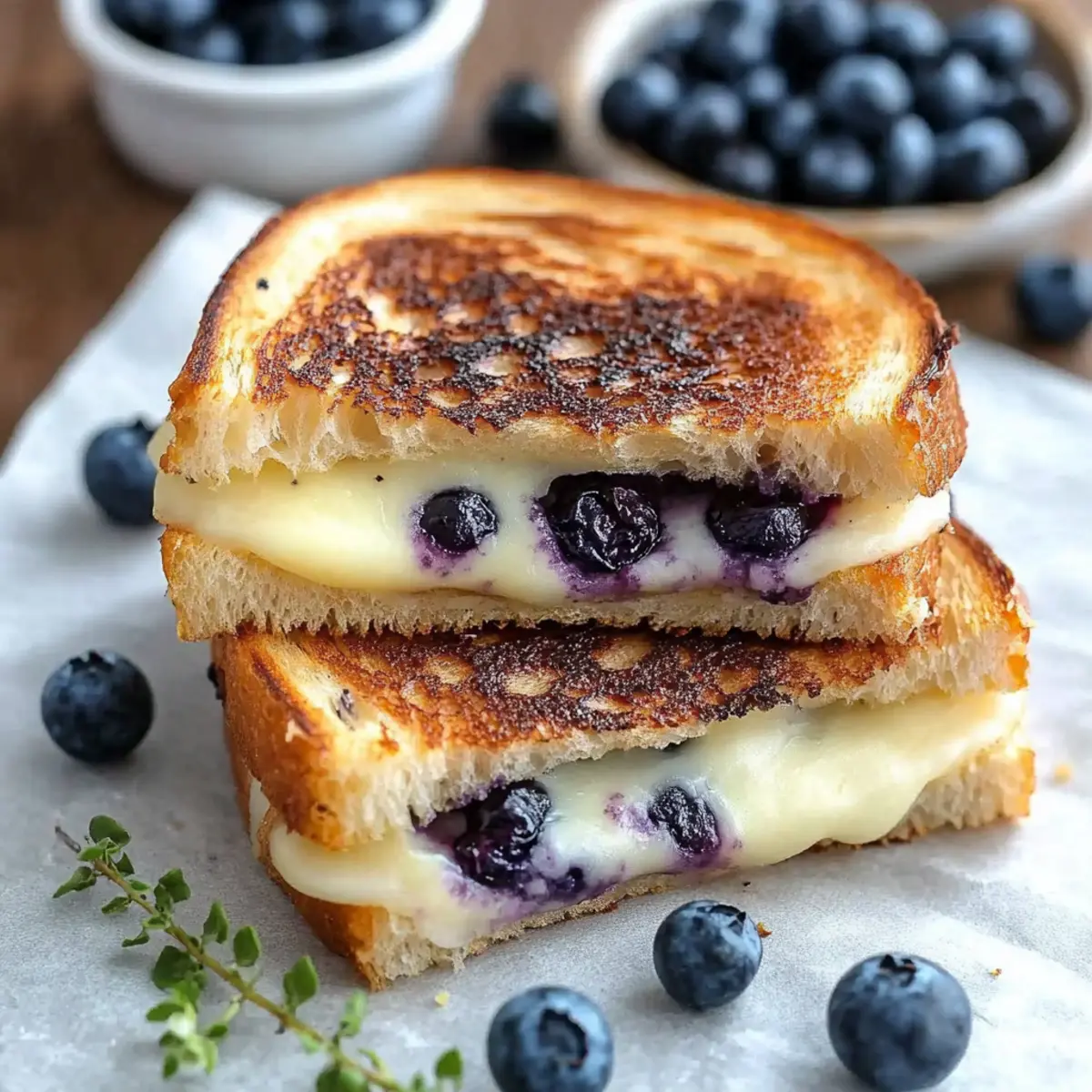 These Gourmet Blueberry Grilled Cheese sandwiches are perfect for busy cooks looking to save time without sacrificing flavor! You can prepare the blueberry compote up to 3 days in advance; simply store it in an airtight container in the refrigerator. The assembled sandwiches can also be prepped and stored wrapped in foil in the fridge for up to 2 days, although be aware that the bread may lose some crispiness. To maintain quality, grill the sandwiches just before serving, allowing the cheese to melt beautifully. When ready, simply heat a skillet over medium heat, add butter, and grill the sandwiches for 2-3 minutes per side until golden and melty. Enjoy a gourmet meal with minimal effort!