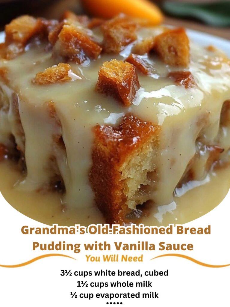Grandma’s Old-Fashioned Bread Pudding with Vanilla Sauce is a timeless dessert that brings warmth, comfort, and nostalgia to the table. With its soft custardy texture, rich vanilla flavor, and simple preparation, it is a recipe that never goes out of style. Whether shared with family or enjoyed quietly at home, this dessert turns humble ingredients into a cherished tradition you will return to again and again.