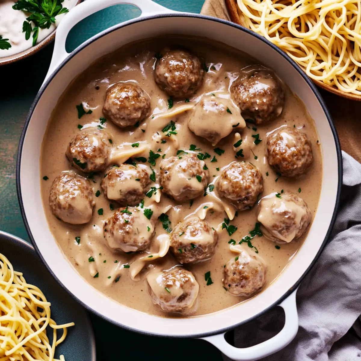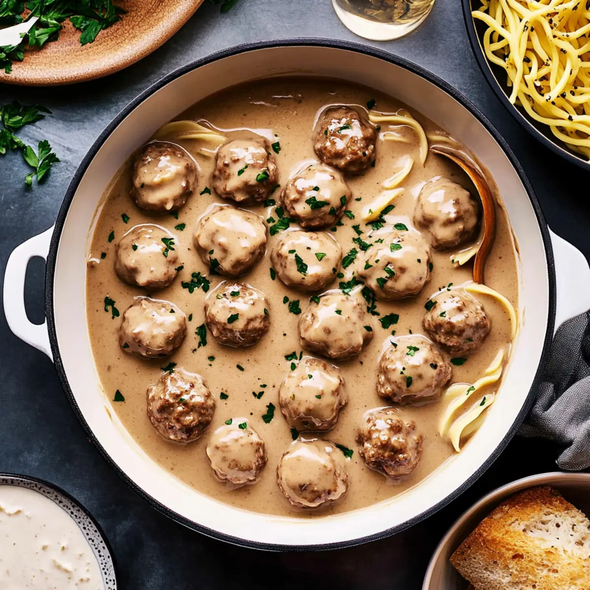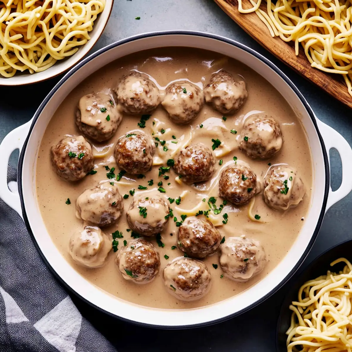 Serve the delightful meatballs and creamy sauce over the buttery egg noodles, garnished with chopped parsley for a fresh touch. Enjoy each comforting bite!