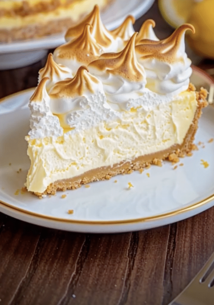 A tall meringue with dramatic peaks makes the cheesecake visually stunning. Serve slices with fresh berries, candied lemon slices, or a drizzle of lemon curd for extra flair. Because the cheesecake holds its shape well, it works beautifully for dinner parties and holiday celebrations.
