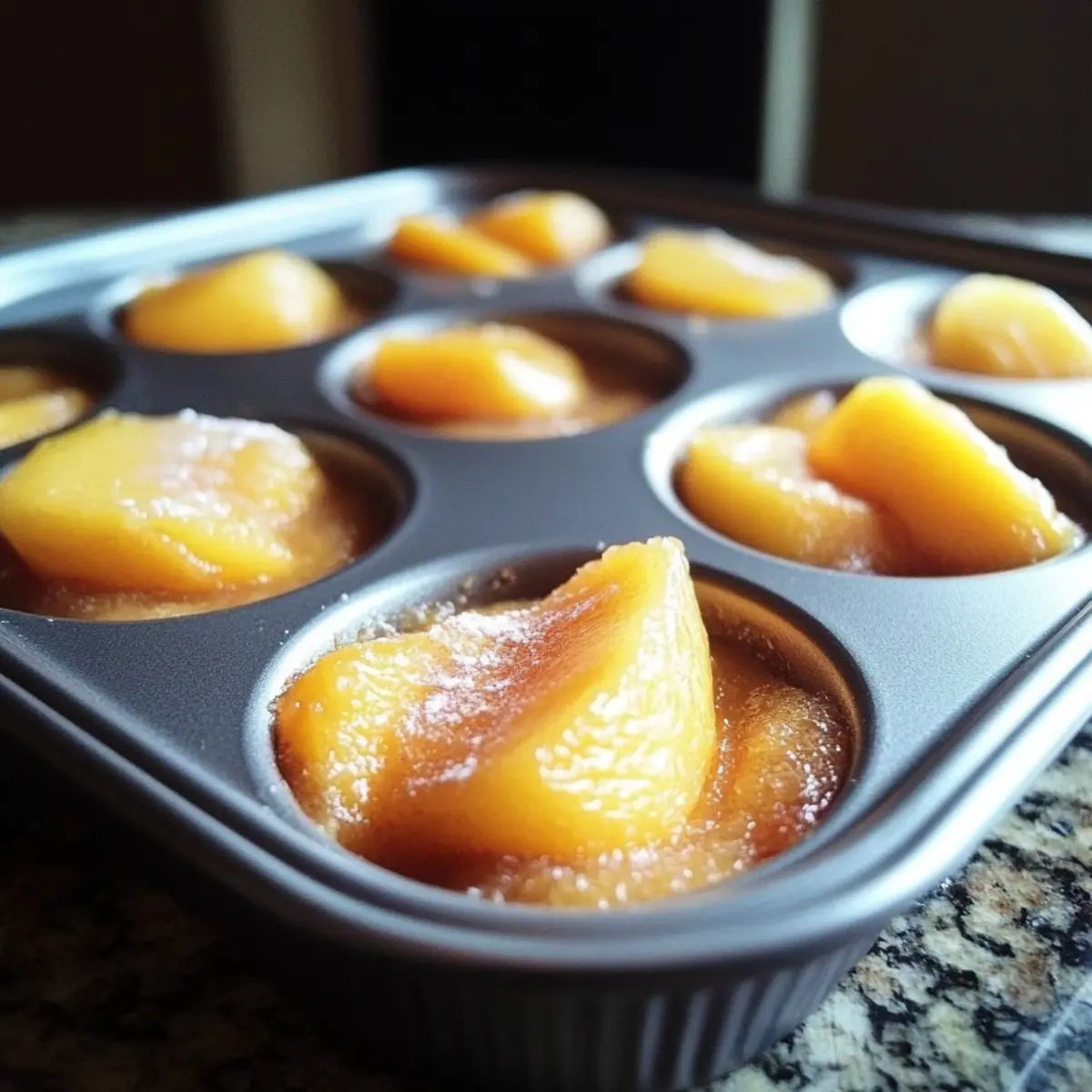 Add the peaches. Generously top each cup with chopped peaches, allowing the sweet fruity goodness to nestle right into the batter.