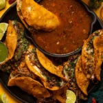 Serve your birria tacos hot with a side of the broth for dipping. Placing additional chopped cilantro and lime wedges on the side adds a fresh touch. You can also serve them with some avocado slices or a dollop of sour cream if you like.