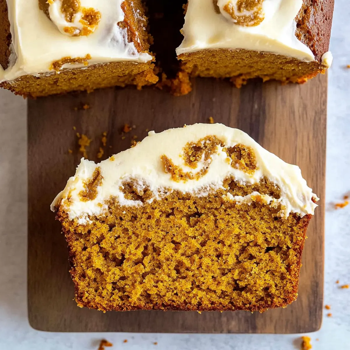 - Frost the cooled pumpkin bread generously with the cream cheese frosting. Slice, serve, and enjoy!