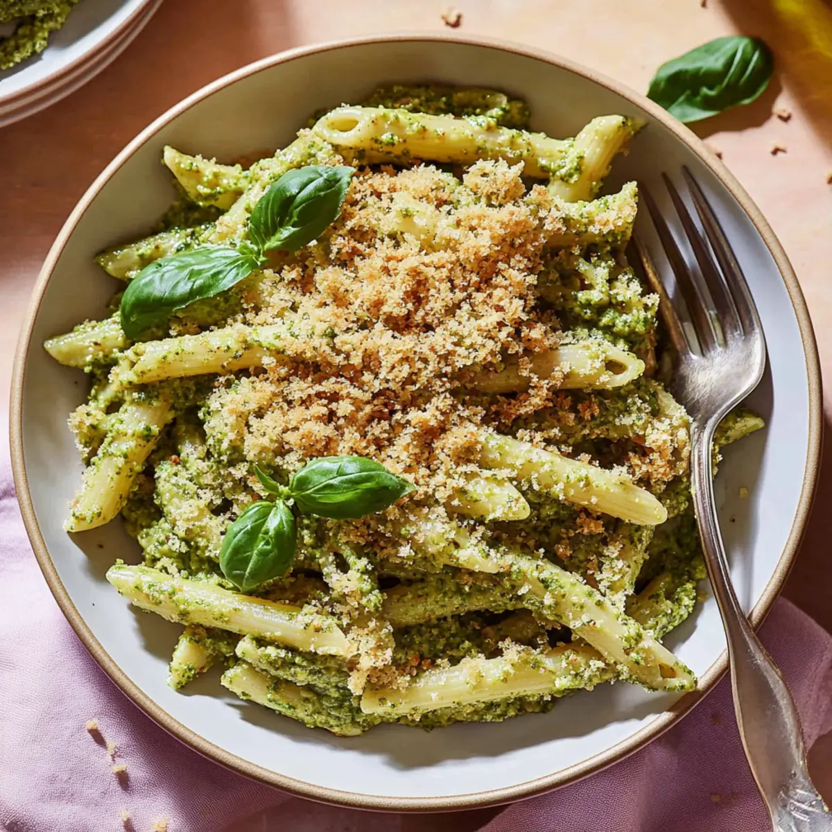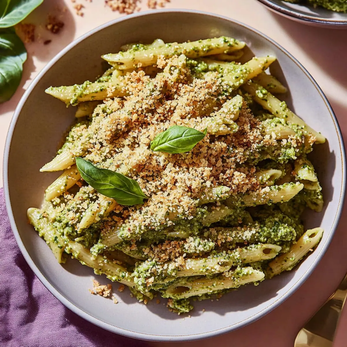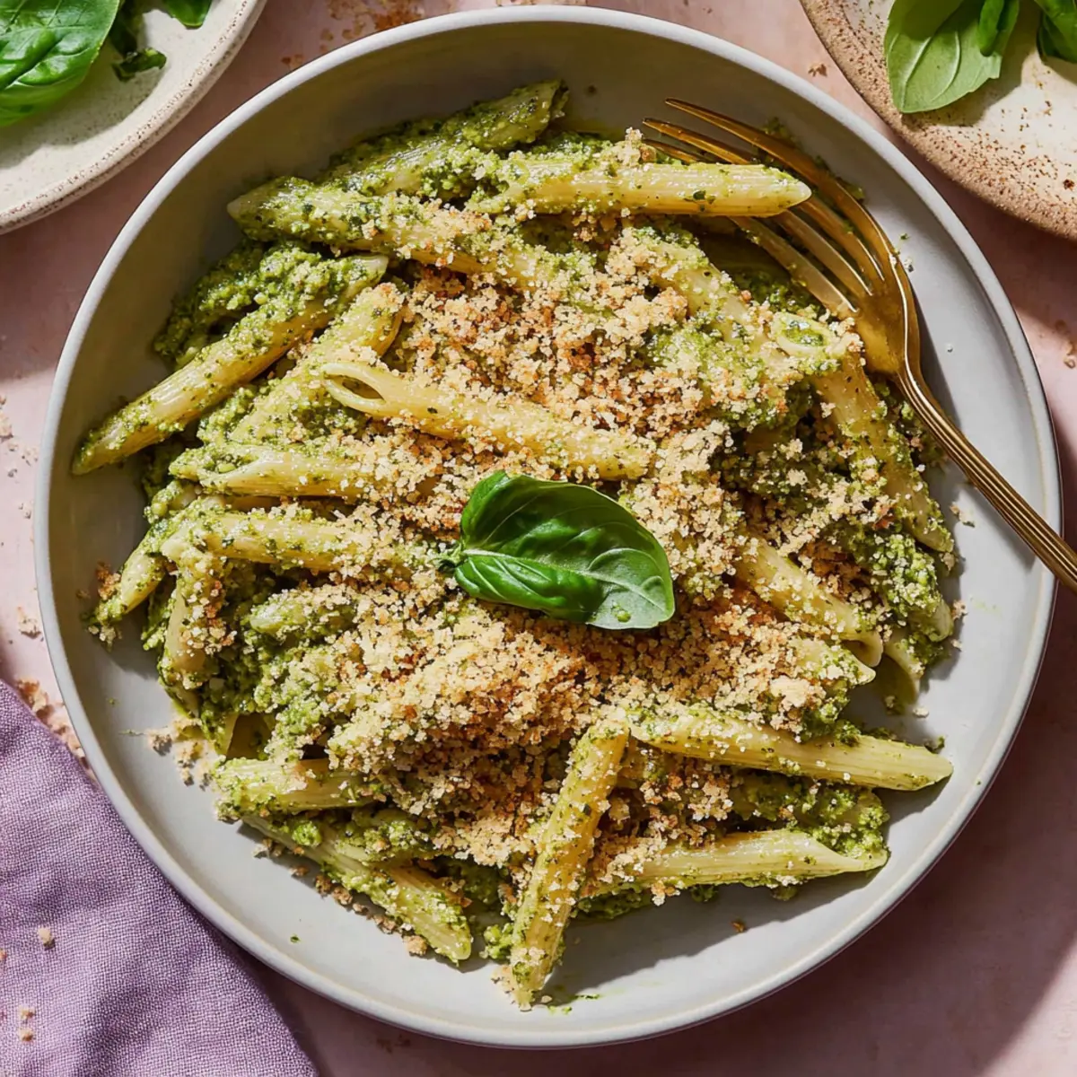 Serve: Plate the pesto pasta and liberally top with the toasted breadcrumbs for a delightful crunch. Dig in and enjoy every bite!